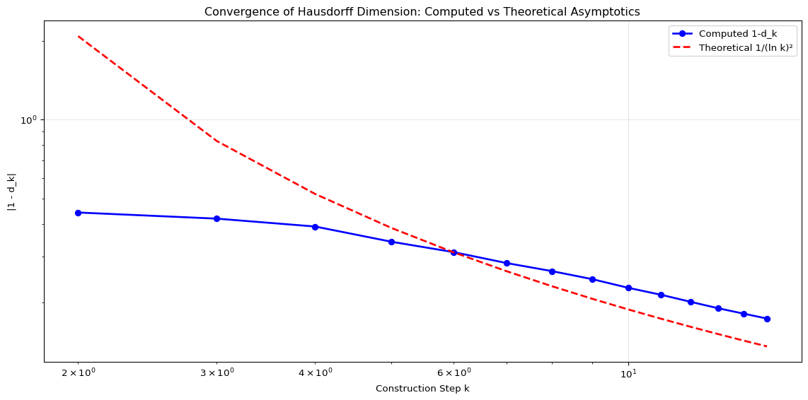 plt.title('Convergence of Hausdorff Dimension: Computed vs Theoretical Asymptotics')