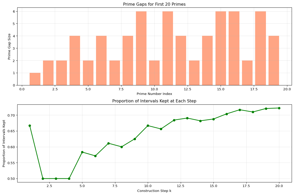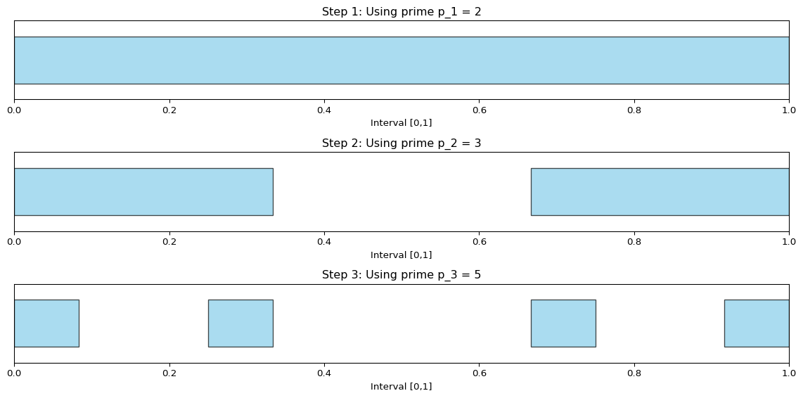 At each stage of the DPC construction, corresponding to a new prime \(p_k\), the surviving intervals are refined based on \(p_k\), and subintervals are removed based on the count of primes up to \(p_k\). This process weaves the very fabric of the prime sequence into the geometric structure of the resulting fractal. The set “breathes” in response to the primes: the density and refinement change step-by-step, influenced by the specific prime used and, implicitly, by the gaps between consecutive primes.