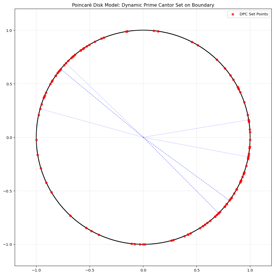 ax.set_title('Poincaré Disk Model: Dynamic Prime Cantor Set on Boundary')