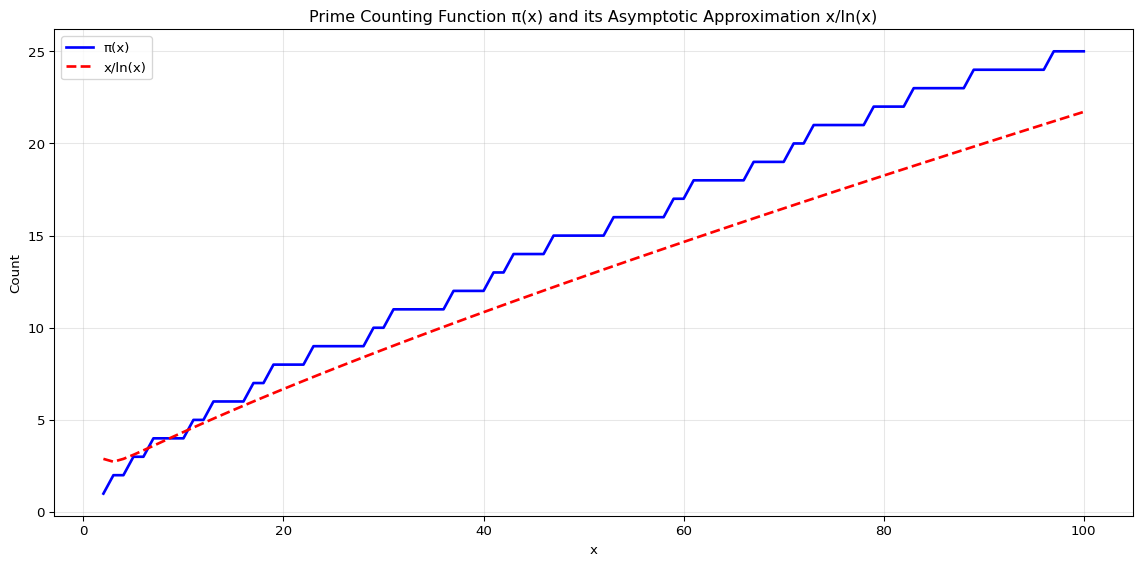 The distribution of prime numbers is fundamental to understanding the Dynamic Prime Cantor Set construction. Let’s visualize the prime counting function \(\pi(x)\) and its relationship to the logarithmic integral.