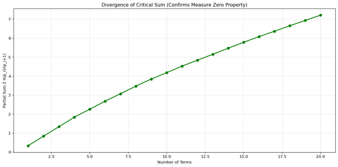 - Cumulatively those tiny removals are enough to kill Lebesgue measure (because \(\sum 1/\ln p_i\) diverges), but not strong enough to push the Hausdorff dimension below 1.