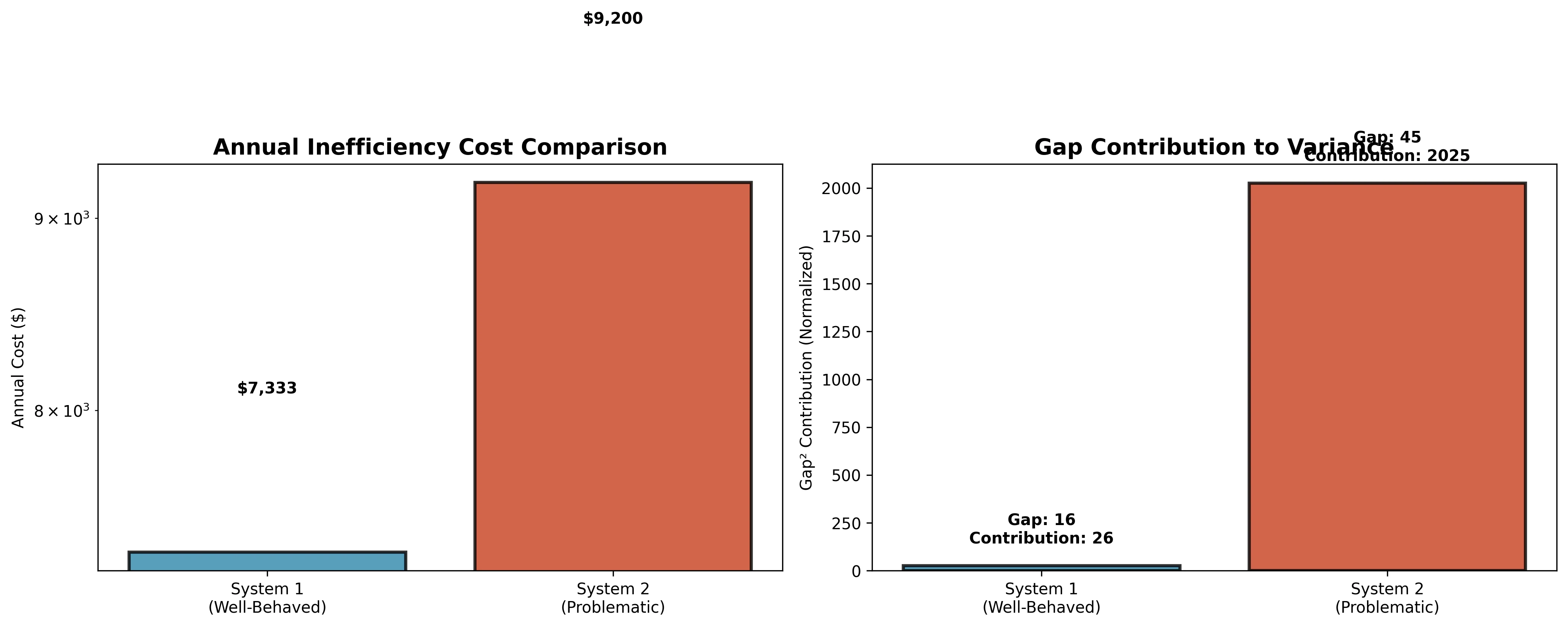 - System 2: Despite the “poor” absolute performance, the system is actually performing at 97% efficiency relative to its structural constraints. The 45-unit load gap creates unavoidable variance.
